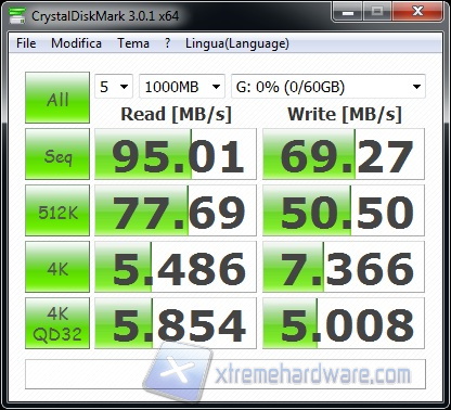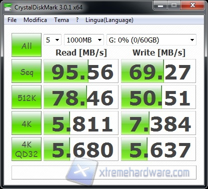 In questa sezione misuriamo le velocità di trasferimento sia sulle porte USB2.0 che le più veloci USB3.0. Per la rilevazione abbiamo scelto 2 tool ormai conosciuti e adottati come standard: ATTO e CrystalDiskMark. I test sono stati svolti sia sulle porte presenti posteriormente sul pannellino I/O che sulle porte USB3.0 disponibili tramite il frontalino accessorio. Ricordiamo che solo 2 delle 6 porte posteriori sono direttamente collegate al chipset Intel Z77, mentre le altre 4 sono collegate tramite l’HUB VL810. E’ una soluzione interessante che non pregiudica le prestazioni, salvo in situazioni particolari, ovvero in caso di utilizzo di due porte collegate tramite lo stesso HUB. In caso di trasferimento dati tra due periferiche USB 3.0 molto veloci, è opportuno collegarle alle porte Intel dirette, o comunque non collegare contemporaneamente più di una alle porte frontale del cabinet disponibili tramite header o alle prime quattro in alto nel pannello posteriore. I casi in cui tutte le porte sono utilizzate contemporaneamente sono però molto rari, quindi il rischio di colli di bottiglia causati dall’HUB è abbastanza ridotto.