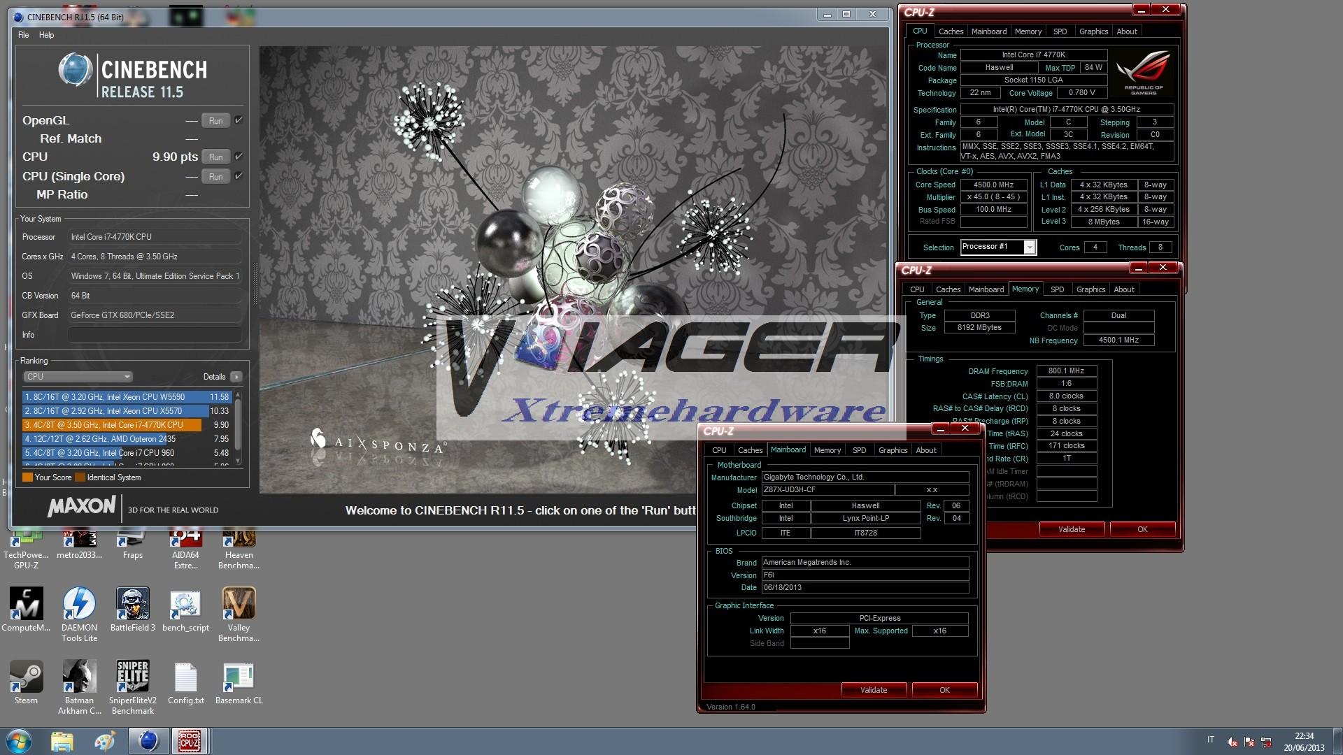 Altro test particolarmente gravoso in quanto sfrutta tutti i threads della CPU per il calcolo matematico ed eseguito con successo senza particolari accorgimenti è Cinebench R11.5. Riguardo i test sotto azoto abbiamo deciso di non pubblicarli in quanto non siamo riusciti a raggiungere risultati degni di nota. La Z87X-UD3H si è bloccata ripetutamente sotto freddo e questo ci ha spinto a non proseguire con i test per non rischiare di fare danni anche ad altri componenti. E’ vero che il modello recensito è di fascia entry-level della serie Z87, quindi non progettata espressamente per l’overclock, ma riteniamo che a titolo di confronto la precedente serie nello specifico la Z77X-UD4H recensita dal nostro laboratorio, sotto azoto è risultata più stabile.