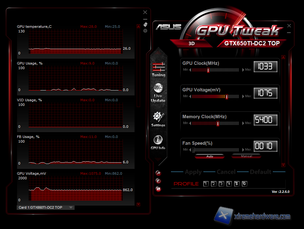 Attivando l'apposita funzione dalle impostazioni è possibile settare anche il GPU Voltage oltre agli altri parametri di tuning, nel nostro caso il vGPU è impostato a 1.075V. Utilizzando questo software abbiamo eseguito varie prove sulla GTX 650Ti di Asus decidendo di procedere nel seguente modo. Abbiamo impostate il vGPU al massimo consentito dal tool di ASUS e successivamente aumentato il regime di rotazione delle ventole oltre la soglia del 50%. Successivamente abbiamo testato la stabilità della scheda procedendo per gradi, fino a trovare la stabilità sia per il core grafico sia per le memorie. ll risultato è stato il seguente: